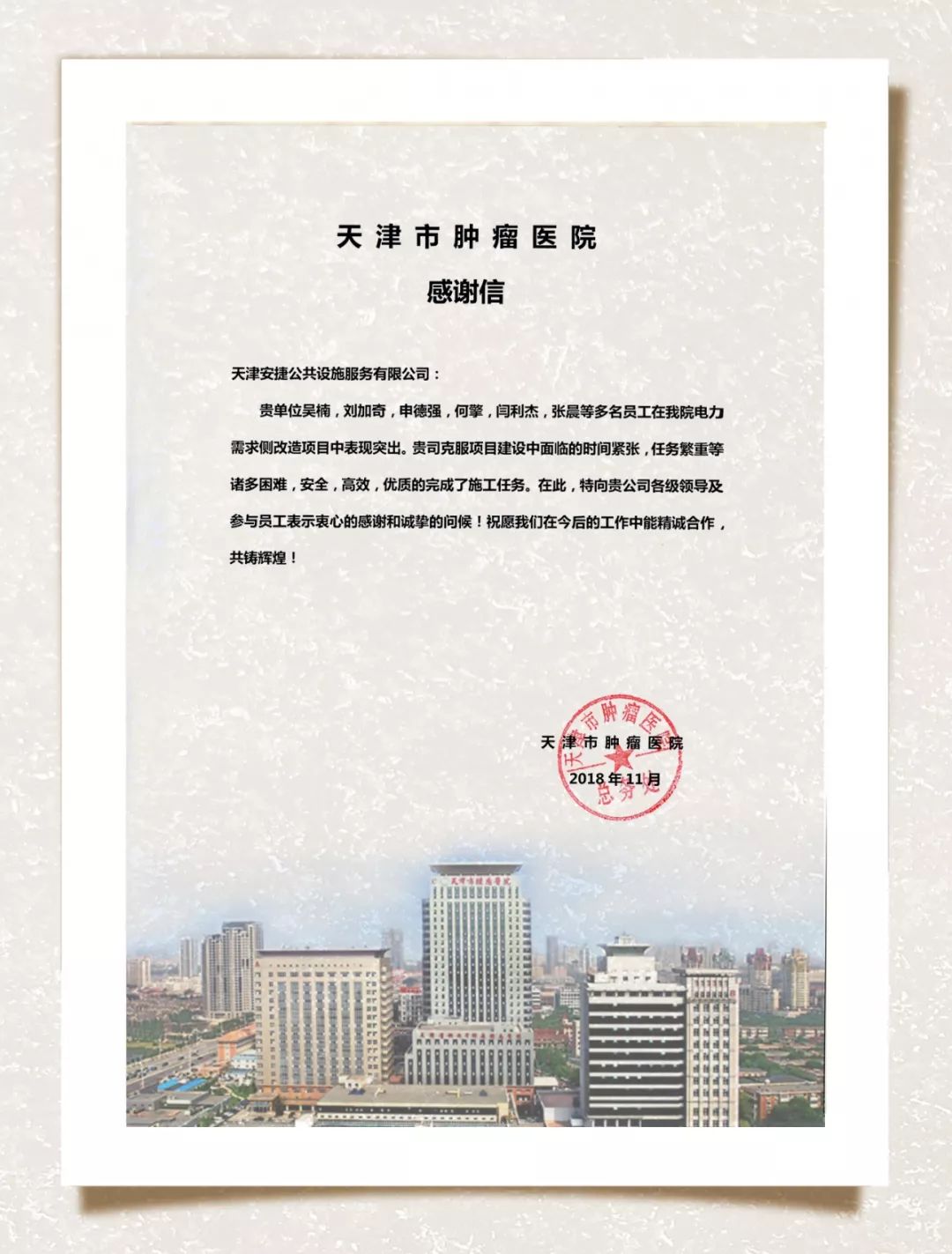 近日,今年会jinnianhui收到了一封来自天津市肿瘤医院的《感谢信》。信中肯定了今年会jinnianhui在电力需求侧改造项目中的突出表现。改造过程中今年会jinnianhui克服了诸多困难,最终安全高效、保质保量地完成了施工任务,得到了天津市肿瘤医院的高度赞扬。